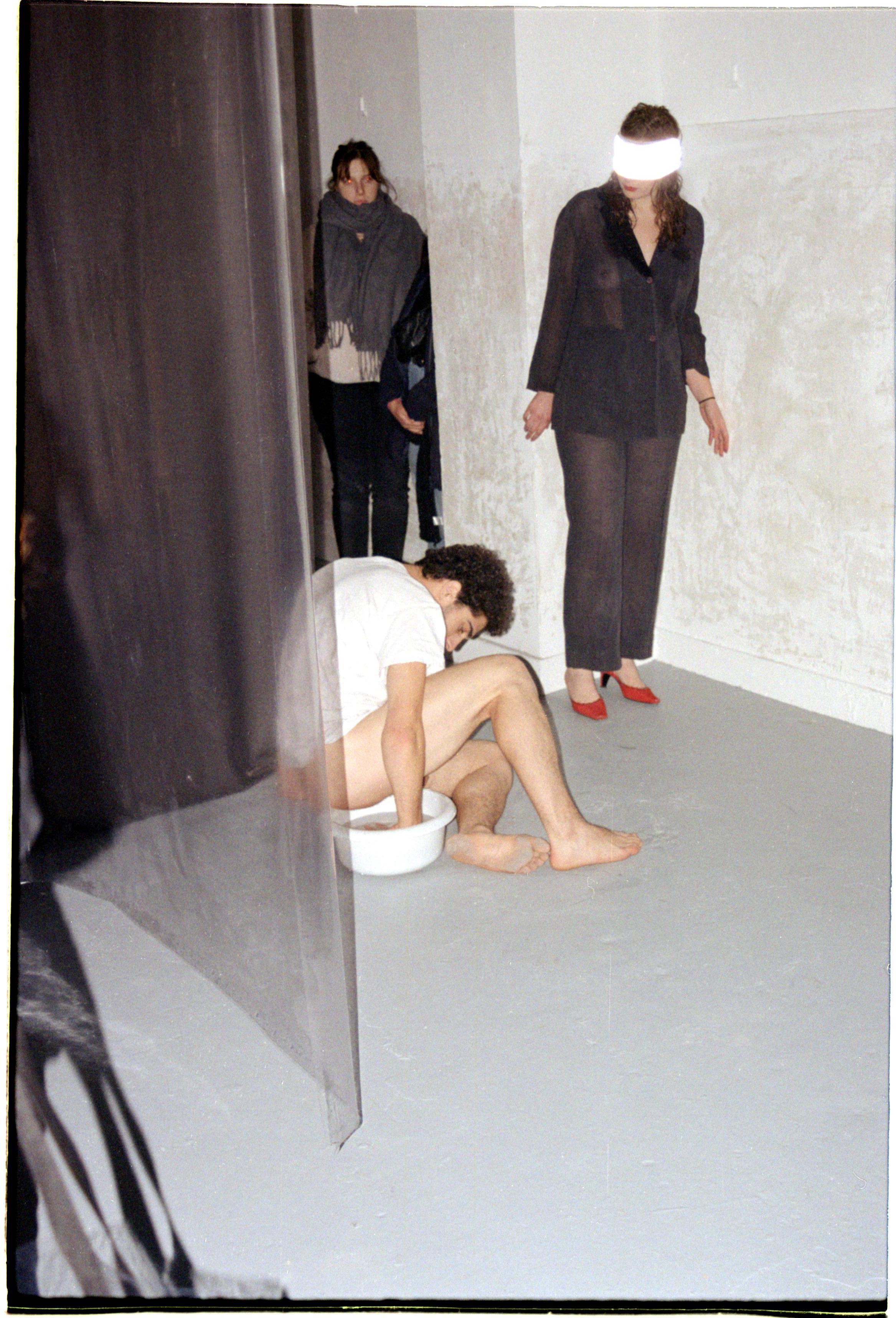 où deux cariatides sont assises sur les hauteurs d’un échaffaudage, au sol un homme se lave les fesses. Une extrême solitude, pourtant cette femme rencontre par la voix un autre être présent dans ce désert, une cantatrice aveugle. Mais l’arrivée impromptue de gardiennes immobilise leur voix.