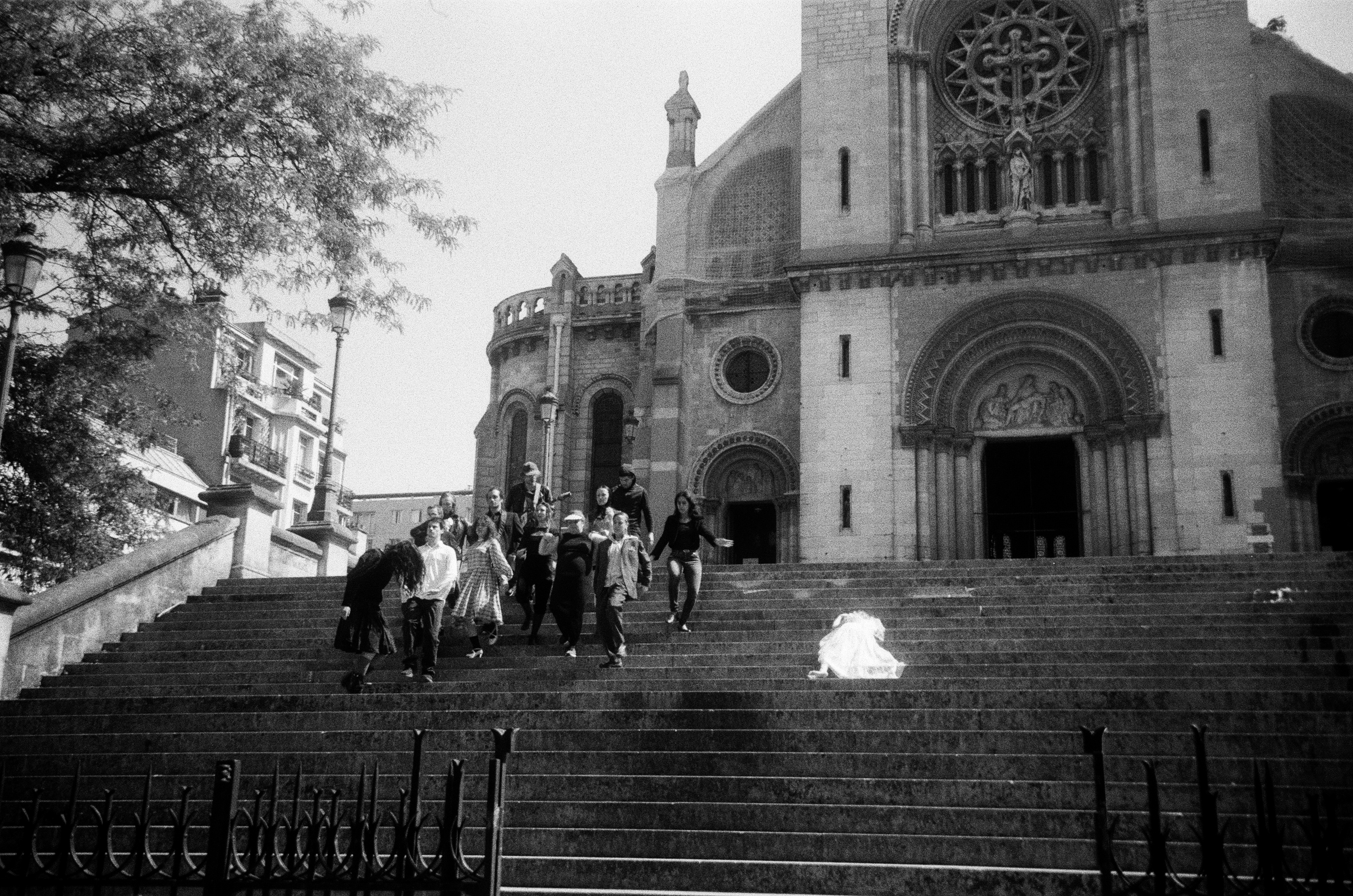 The shot are lined up, the Authority figure points them out. All turn around and come spit on the Authority. A little girl arrives. They follow her on all fours, one behind the other. At the top of the stairs, the little girl faints, a man comes to pick her up. Chorus of the shot on the stairs. The little girl shouts “Yes!” then fled.